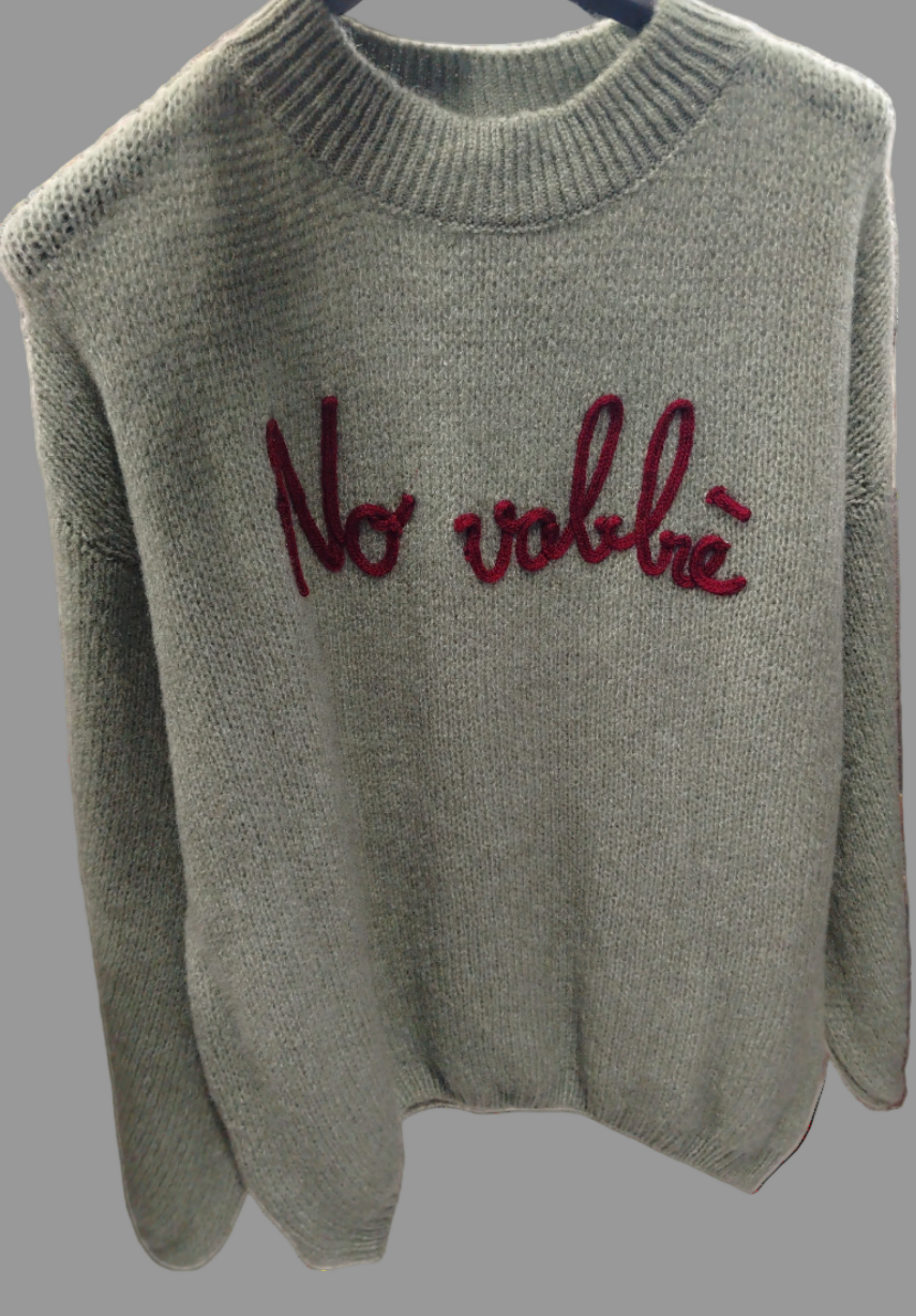 Maglione Must Have con scritta “No vabbè” a contrasto, taglio oversize con maniche ampie e collo rotondo.